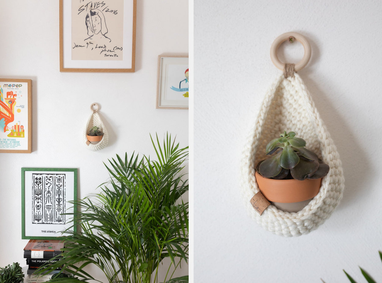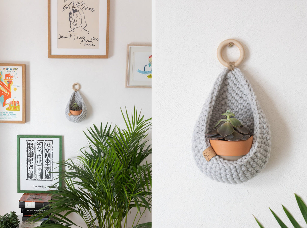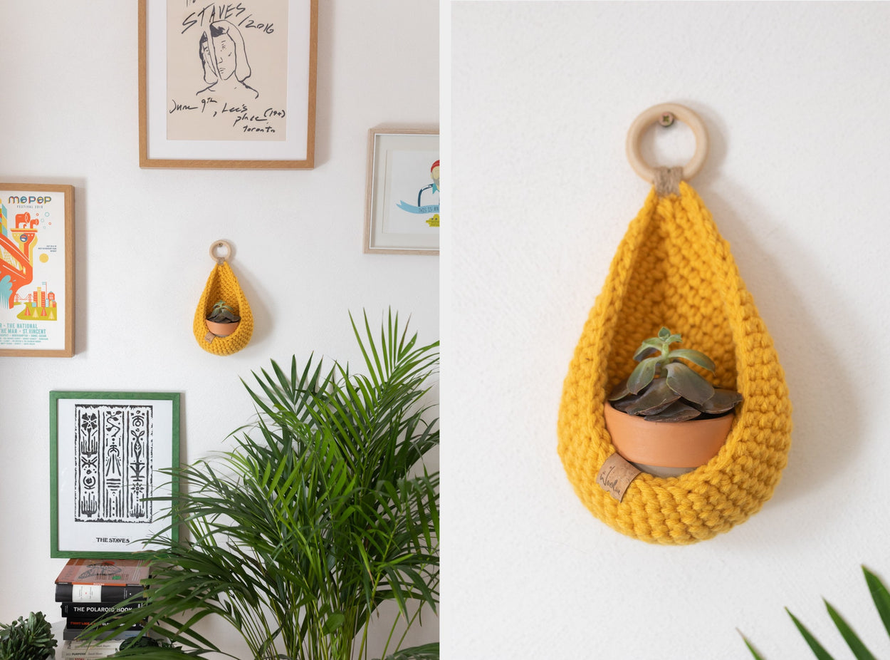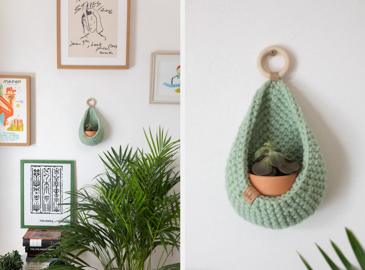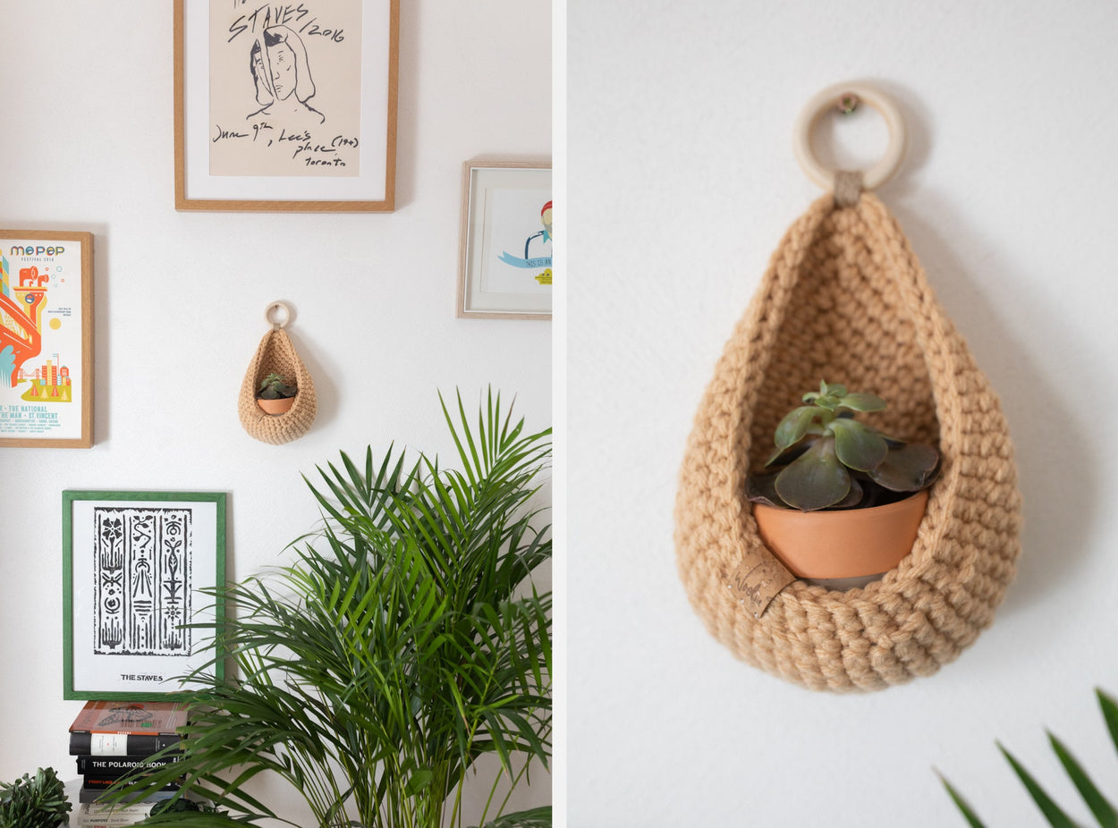 Handmade crochet hanging basket, ideal for small trinkets or succulents. Available in a wide variety of colours and created using luxury, premium blend yarn.